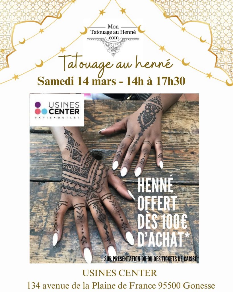 Retrouvez-moi le samedi 14 mars de 14h00 à 17h30 au centre commercial Usines Center à Gonesse pour des tatouages au henné naturel.
