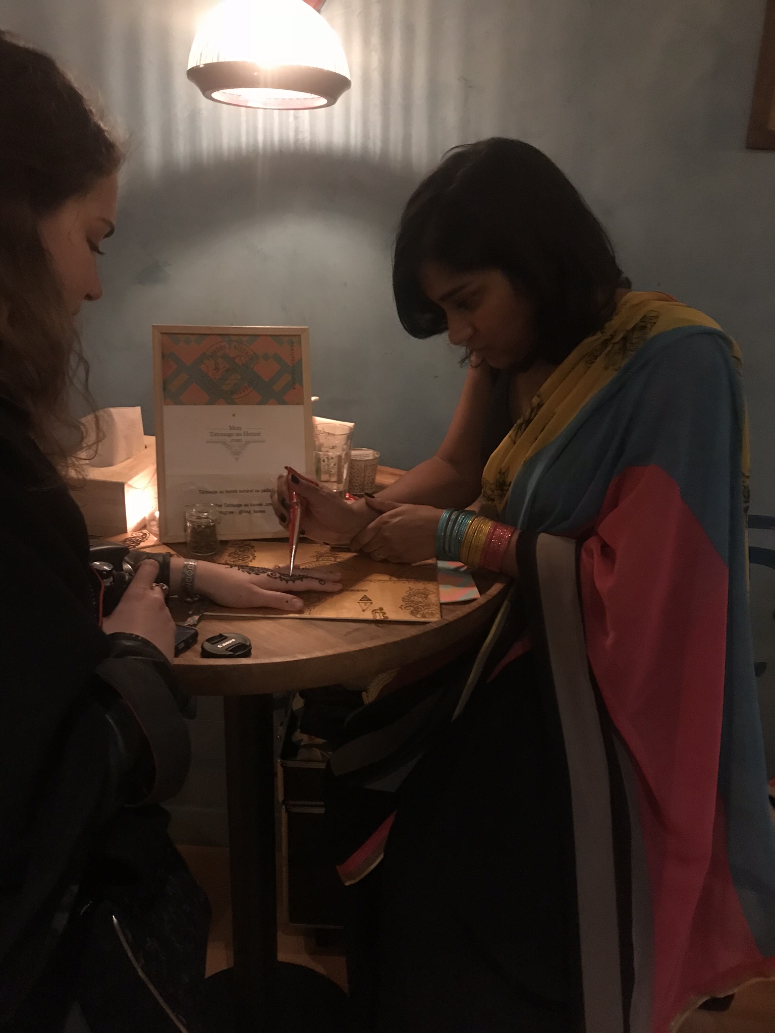 Sous une lumière tamisée, accoudée à une petite table sur laquelle sont dispersés poudre de henné, dessins envoûtants et autres merveilles… une jeune femme tout en discrétion trace des lignes éphémères sur les mains de passants.